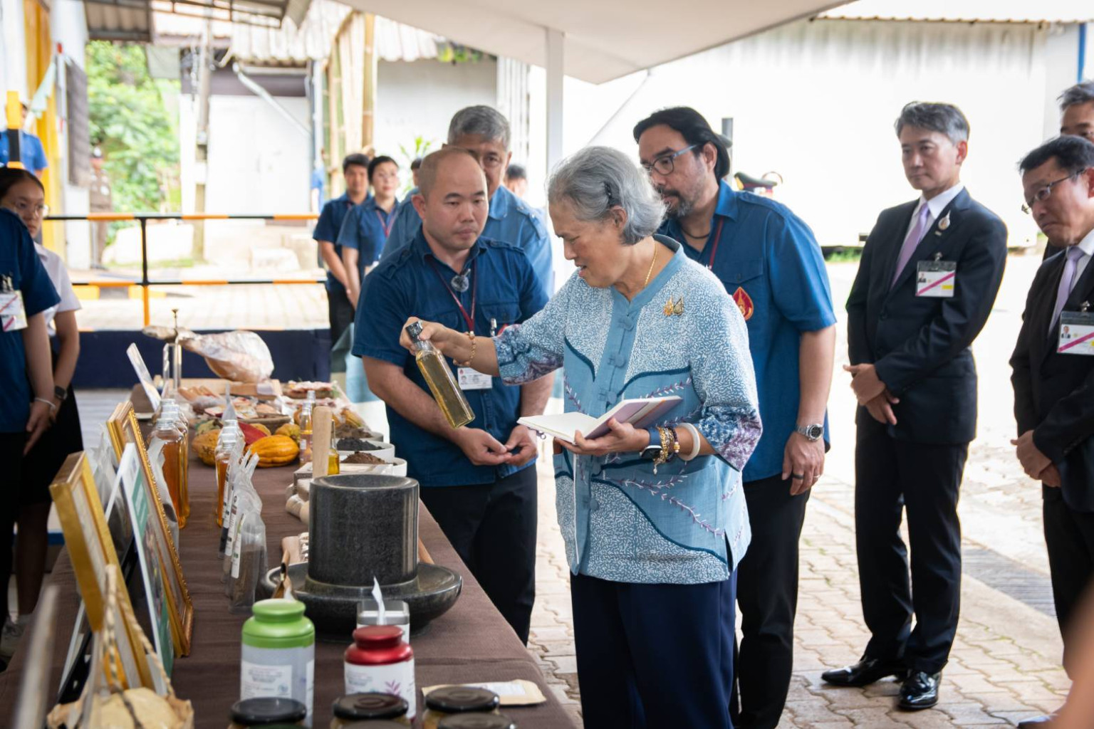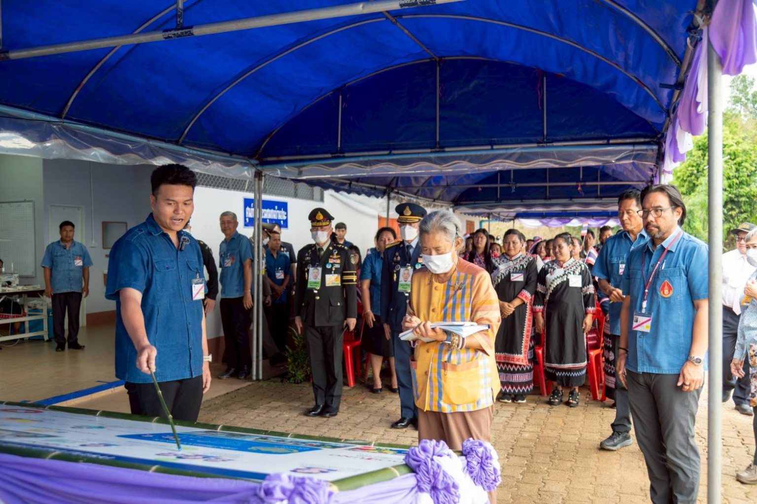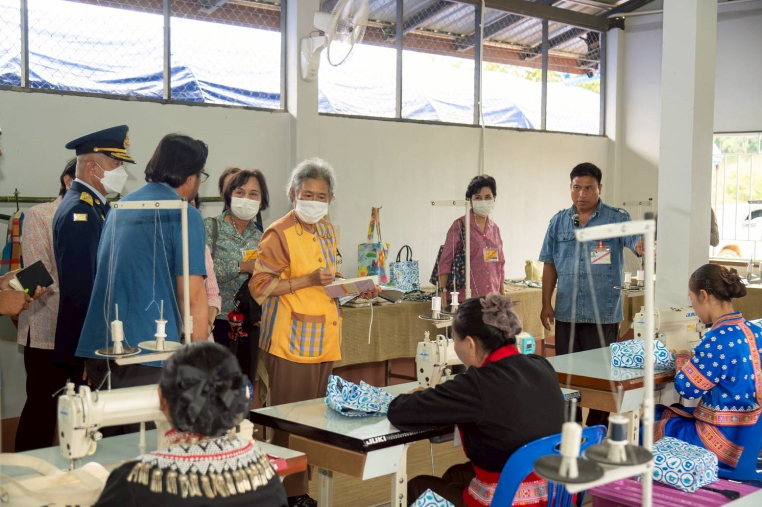 จากนั้น เสด็จฯ ไปทอดพระเนตรศูนย์หัตถกรรมชุมชน ซึ่งมูลนิธิแม่ฟ้าหลวง ฯ รับสนองพระราชดำริพัฒนาคุณภาพชีวิตประชาชนอย่างครบวงจร และเพื่ออนุรักษ์ภูมิปัญญาท้องถิ่นและสร้างอาชีพเสริมให้แก่ราษฎร โดยมูลนิธิแม่ฟ้าหลวงฯ นำธุรกิจเพื่อสังคมแบรนด์ดอยตุงเป็นผู้ฝึกอบรมและออกแบบผลิตภัณฑ์ ฝึกอบรมให้ราษฎรเย็บจักรได้ตามมาตรฐานพร้อมกับจ้างงานกลุ่มสตรีในชุมชน