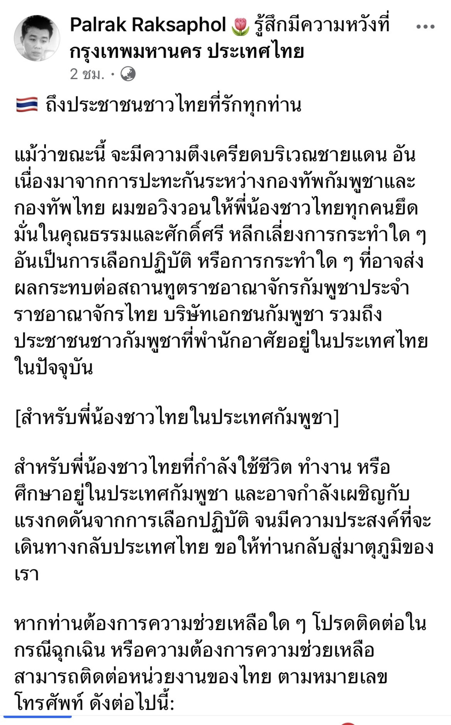 เมื่อวันที่ 25 ก.ค.68 นายพลรักษ์ รักษาพล คณะทำงานรัฐมนตรีว่าการกระทรวงยุติธรรม โพสต์ข้อความผ่านเฟซบุ๊กส่วนตัว "Palrak Raksaphol" ระบุว่า ถึงประชาชนชาวไทยที่รักทุกท่าน