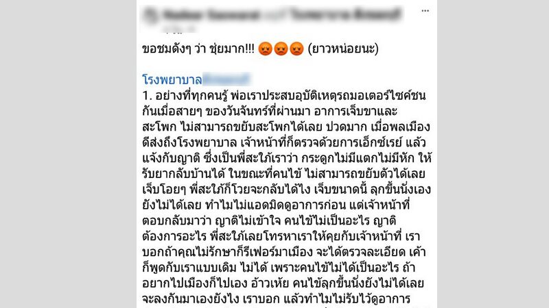 วันที่ 10 เม.ย.2566 ผู้สื่อข่าวรายงานว่า มีหญิงสาวรายหนึ่ง โพสต์ข้อความผ่านเฟซบุ๊ก ร้องเรียนรพ.แห่งหนึ่งใน จ.กาญจนบุรี หลังพ่อประสบอุบัติเหตุ จยย.ชน กระดูกสะโพกหัก แต่หมอกลับแจ้งว่า กระดูกไม่หัก โดยหญิงสาวคนดังกล่าว ระบุว่า ขอชมดังๆ ว่า ชุ่ยมาก (ยาวหน่อยนะ)