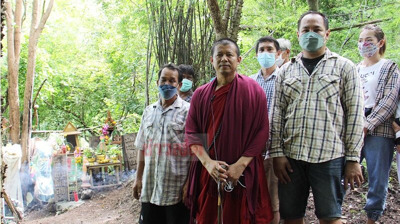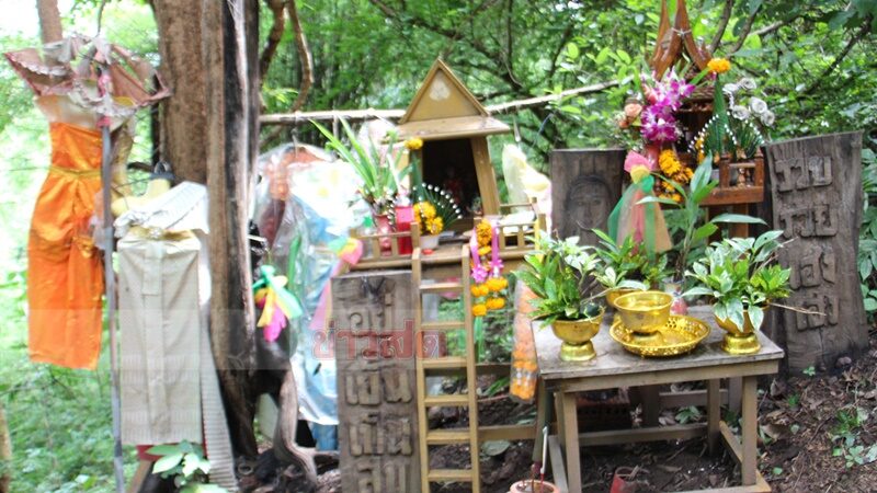 " อยู่มาวันหนึ่งได้ลงไปตามบอกให้เอาชุดไปคืน ทำให้คืนนั้นต้องช่วยกันหามชุดไทยขึ้นเขามาส่งคืนเกือบ 20 ชุด จากนั้นผ่านไปประมาณ 2 วัน เกิดไฟไหม้ชุดไทยทั้งหมด พระอาจารย์ได้ขึ้นมาบอกท่านว่า ถ้ามีอะไรที่ทำให้มนุษย์ผิดไปก็ขอขมา และพระอาจารย์ท่านไปว่าถ้าให้โยมที่ขึ้นมาขอโชคลาภแล้วจะมาสร้างศาลให้ ต่อมามีโยมคนหนึ่งมาขอโชค และบอกจะมาสร้างศาลให้ก็มีโชคงวดนั้นเลยจึงได้มาสร้างศาลให้ตามคำที่พูดไว้