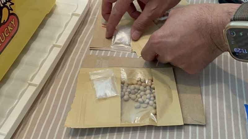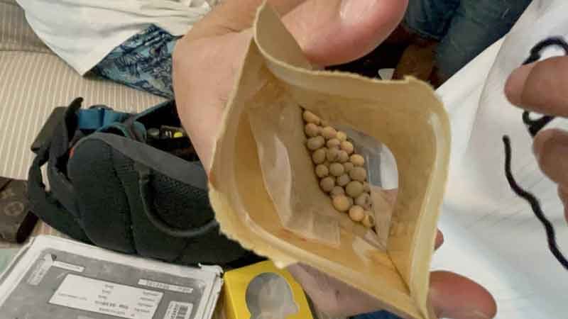 4. กล่องพัสดุสีน้ำตาล จำนวน 15 กล่อง 5. ถุงพลาสติกแบบรูดปิดดึงเปิด จำนวน 1 แพ็ค 6. เครื่องปริ้น จำนวน 1 เครื่อง 7. กระดาษปริ้น จำนวน 9 ม้วน 8. ซองกระดาษสีน้ำตาลภายในบรรจุเม็ดถั่ว จำนวน 50 ซอง โดยจับกุมได้ภายในบ้านหลังหนึ่ง ซอย 13 หมู่บ้านทาวน์พลัส (เกษตร-นวมินทร์) แขวงนวลจันทร์ เขตบึงกุ่ม กทม.