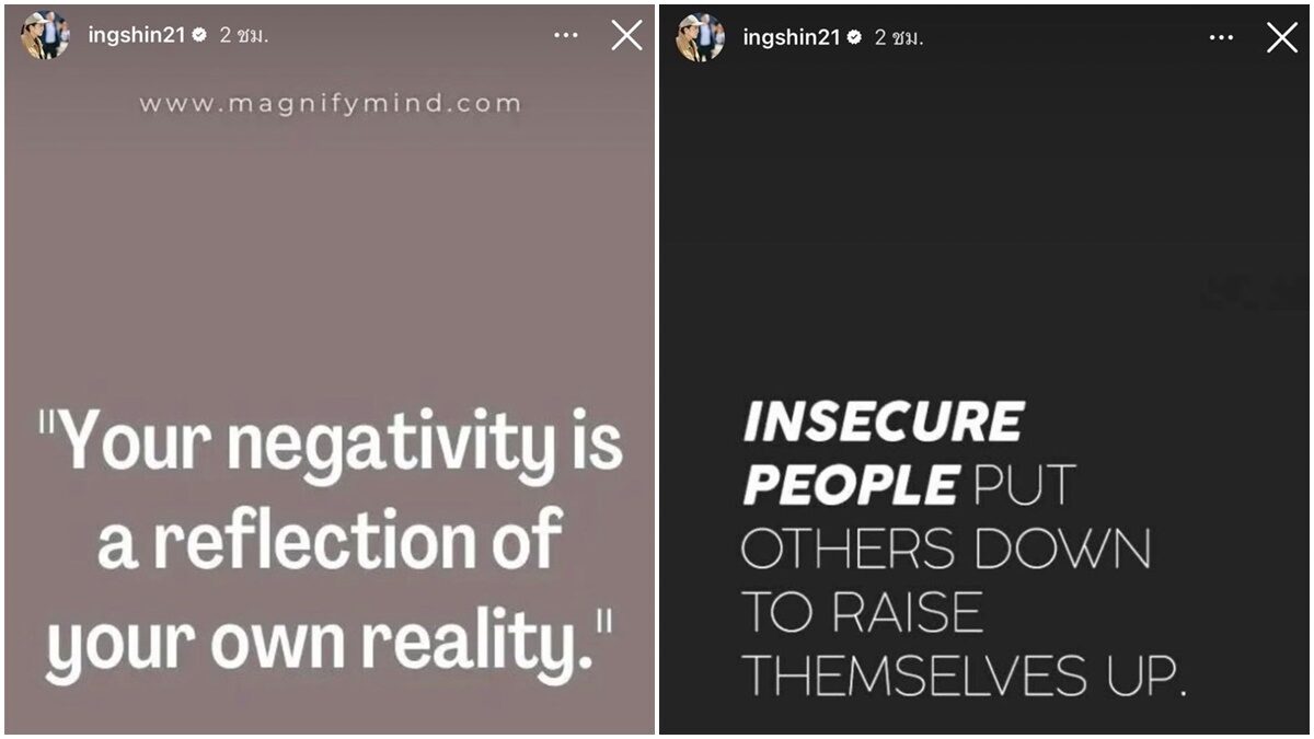 โดย น.ส.แพทองธาร โพสต์ข้อความภาษาอังกฤษว่า "Your negativity is a reflection of your own reality." แปลว่า "ความคิดเชิงลบของคุณ สะท้อนถึงความเป็นจริงของตัวคุณเอง"