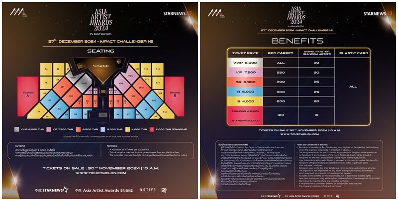 มาร่วมสร้างช่วงเวลาแห่งประวัติศาสตร์ไปกับ “2024 Asia Artist Awards IN BANGKOK” ครั้งแรกที่จัดขึ้นในประเทศไทย จำหน่ายบัตรในวันเสาร์ที่ 30 พฤศจิกายน 2567 เวลา 10.00 น. ทาง www.ticketmelon.com ราคาบัตรมี 6 ราคา ได้แก่ VVIP 8,000 บาท / VIP 7,500 บาท / 6,500 บาท / 5,000 บาท / 4,000 บาท และบัตรยืนราคา 2,000 บาท
