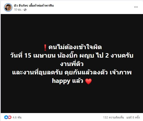 ล่าสุด ดิว ธีรภัทร โพสต์ชี้แจงเคลียร์ดราม่า บิ๊ก ผู้ใหญ่บ้านฟินแลนด์แล้ว พร้อมจบประเด็นดราม่าว่า “คนที่ให้ใจ ได้ใจ ก็เอาไปเลย 15 เมษายนนี้ เจอกัน โอน 3 แสน ทำมาลัยรอน้องชายบิ๊ก ผญบ ฟินแลนด์ เป็นน้ำใจเล็กๆน้อยๆจากพี่ดิว ธีรภัทร ขอบคุณที่คำมั่นสัญญาเรายังเหมือนเดิม รักน้องบิ๊กที่สุด ผู้ใหญ่บ้านฟินแลนด์ #ดิวธีรภัทร”