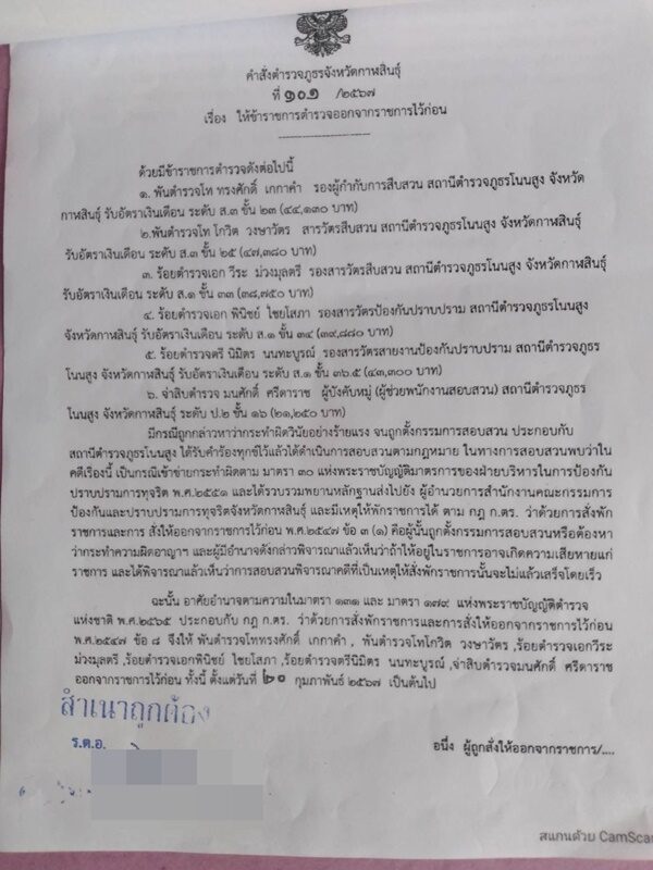 วันที่ 23 ก.พ.67 ผู้สื่อข่าวรายงานว่า มีคำสั่งตำรวจภูธรจังหวัดกาฬสินธุ์ ที่ 101/2567 เรื่อง ให้ข้าราชการตำรวจออกจากราชการไว้ก่อน ด้วยมีข้าราชการตำรวจดังต่อไปนี้