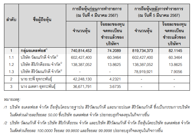 การซื้อขายหุ้นดังกล่าวเป็นการซื้อขายผ่านระบบการซื้อขายของตลาดหลักทรัพย์แห่งประเทศไทย บนกระดานรายใหญ่ (Big Lot Board) ในวันที่ 5 มีนาคม 2567 ซึ่งส่งผลให้การถือหุ้นของบริษัท ในกลุ่มอเดลฟอส ซึ่งประกอบด้วย บริษัท วัฒนภักดี จำกัด บริษัท สิริภักดีธรรม จำกัด และบริษัท สิริวัฒนภักดี จำกัด และการถือหุ้นของบริษัทของนายระพี อุทกะพันธุ์ และนางเมตตา อุทกะพันธุ์ เปลี่ยนแปลงไปดังนี้