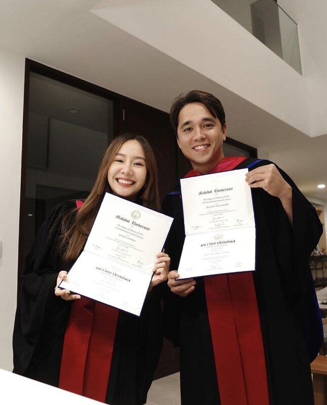 จบ ป. โทแล้ว? “จริงๆ ก็จบมาสักพักแล้วค่ะ แต่ว่าเพิ่งมีโอกาสได้เอาชุดครุยมาถ่ายรูปกับอเล็กซ์ค่ะ(ยิ้ม) (เรียนมา 5 ปีเลย?) เอาแบบเต็มแม็กซ์ค่ะ เขาให้แค่ไหนเราทำเต็มที่เลยค่ะ(กว่าจะได้มาก็เหนื่อยยากเหมือนกัน?) ก็ยากเหมือนกันค่ะ ด้วยความที่เราก็ทำงานอื่นๆ ด้วย จริงๆ ก็ได้มานั่งทำธีสิสจริงๆ ช่วงโควิดเลยค่ะ มีเวลามานั่งทำเปเปอร์ คือการลงพื้นที่สำหรับเต้ยมันจอยมาก แต่การทำเปเปอร์มันไม่ไหวอ่ะ”