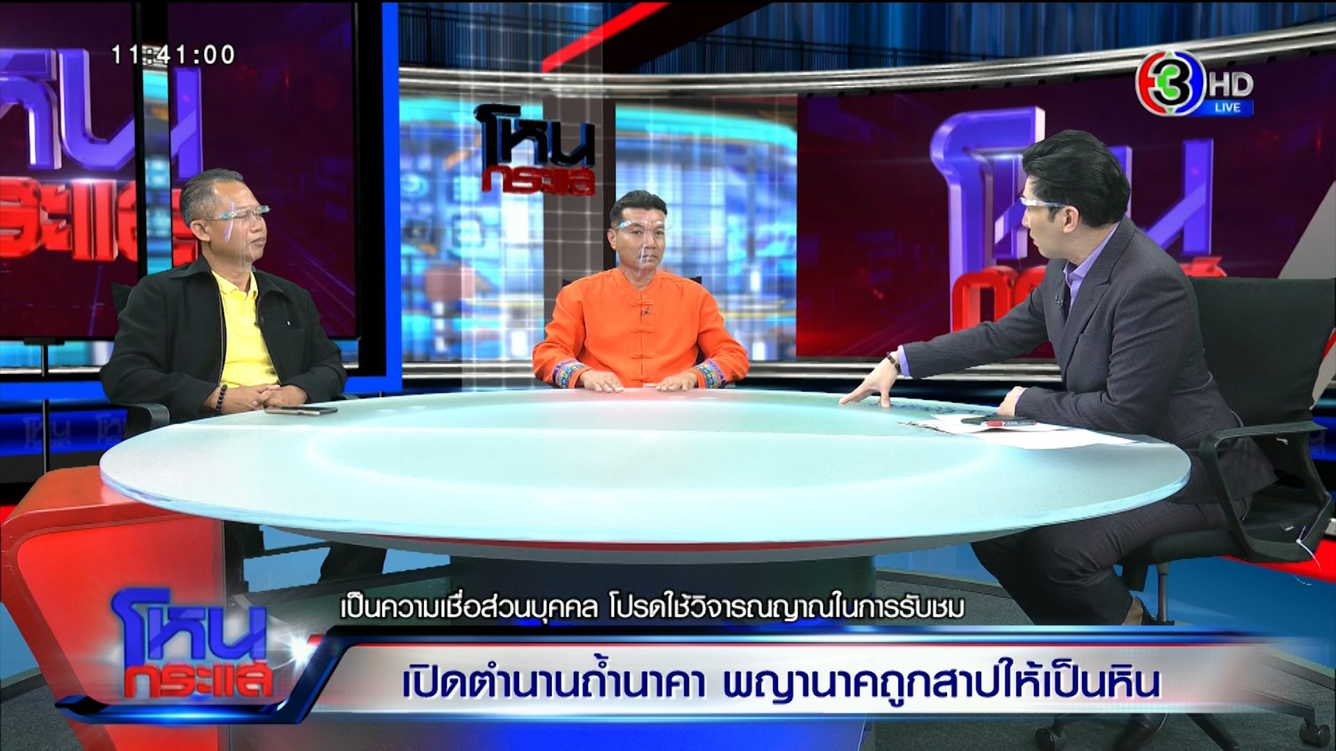 รายการโหนกระแสวันที่ 3 มิ.ย. "หนุ่ม กรรชัย กำเนิดพลอย" ในฐานะผู้ดำเนินรายการ ผลิตในนามบริษัท ดีคืนดีวัน จำกัด ออกอากาศทุกวันจันทร์-ศุกร์ เวลา 12.20 น. ทางช่อง 3 กดเลข 33 เปิดใจสัมภาษณ์ "สำรวย ศรีทิน" อดีตผู้ใหญ่บ้านบึงโขงหลง "ธนวณิช ชัยชนะ" หรือ "คุณอ๊อด" อุปนายกสมาคมธุรกิจการท่องเที่ยวที่จ.บึงกาฬ กรณีฮือฮา "ถ้ำนาคา" ซึ่งมีลักษณะเหมือนงูขดอยู่จนเป็นถ้ำ โดยมีกระแสลือว่าเป็นพญานาคถูกสาปให้แข็ง