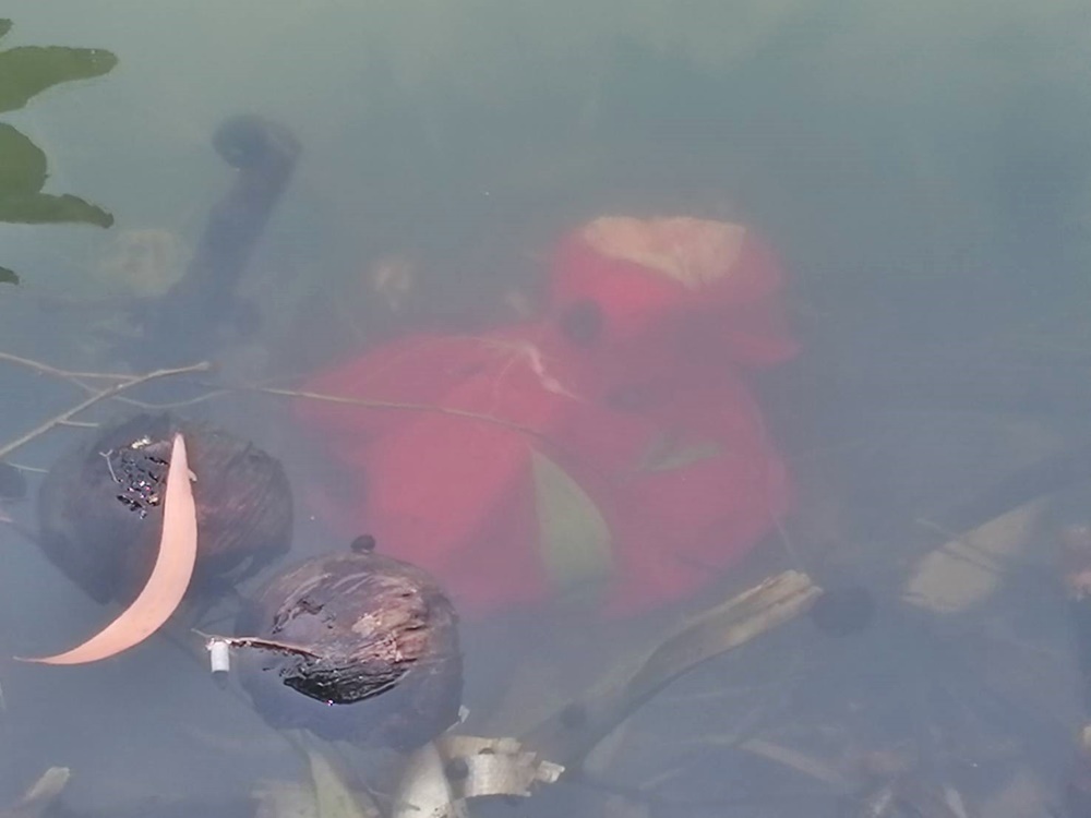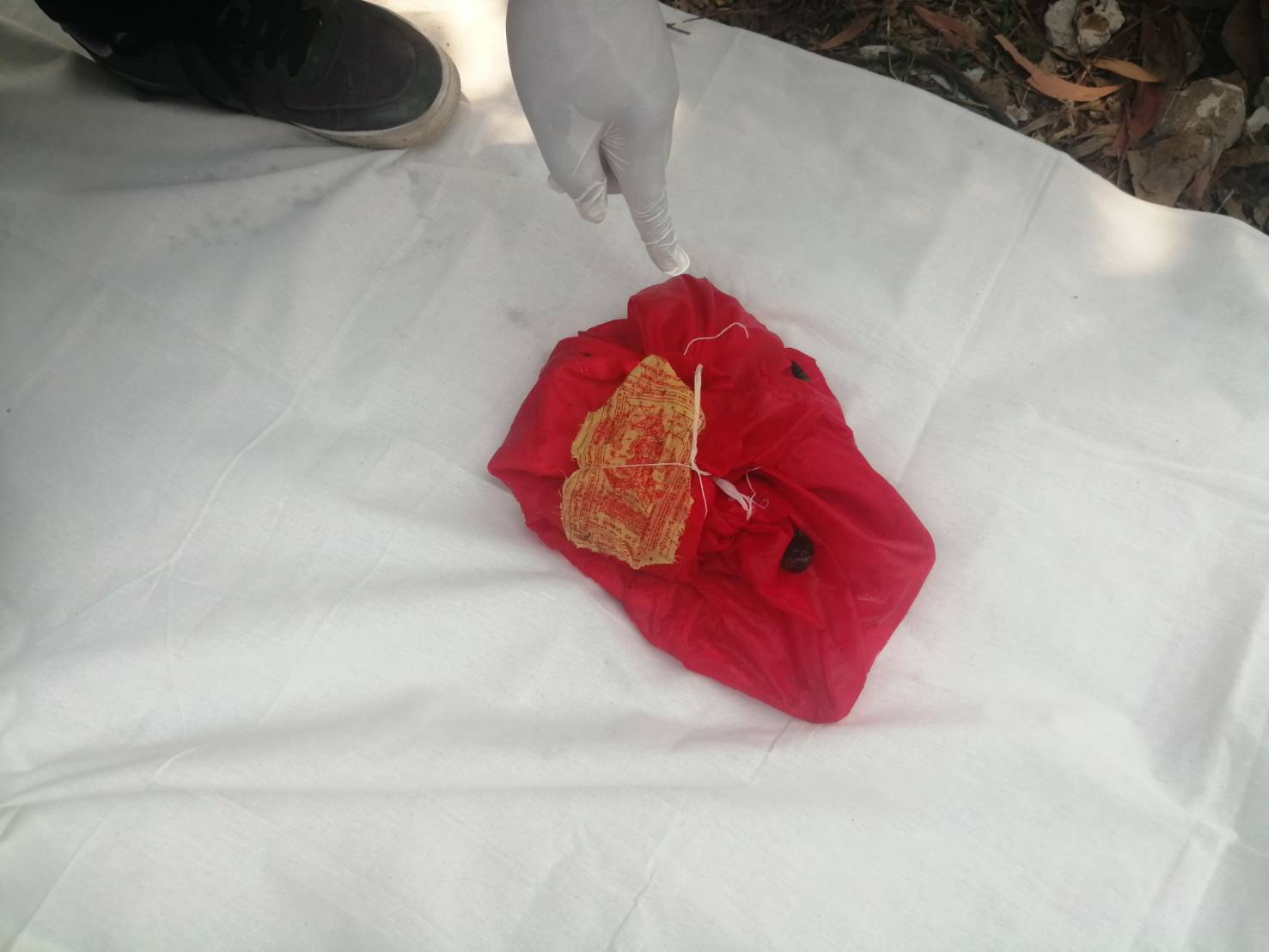 ต่อมาตำรวจ สภ.นางรอง อ.นางรอง และหน่วยกู้ภัยสยามรวมใจปู่อินทร์ นางรอง เข้าไปตรวจสอบ โดยหน่วยกู้ภัยสยาม ลงสระน้ำไปหยิบห่อผ้าสีแดงดังกล่าวขึ้นมา เมื่อแกะห่อผ้าดู พบมีธูป 1 กำ เทียนสีเหลืองเล่มเล็กกว่า 10 เล่ม ดอกไม้ เงินเหรียญบาท จำนวน 10 เหรียญ และมะนาวผ่าครึ่งลูกอีกจำนวนหนึ่ง หน่วยกู้ภัยและเจ้าหน้าที่ตำรวจทำได้เพียงถ่ายภาพไว้เป็นหลักฐานแล้วห่อผ้าแดงวางลงในน้ำคืน