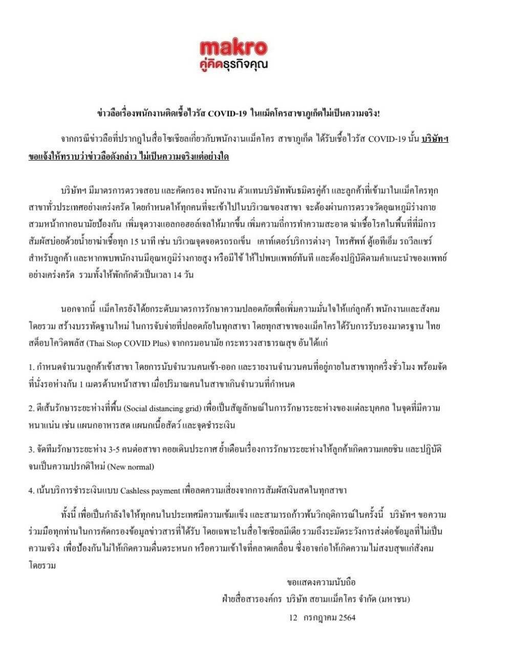 วันที่ 13 ก.ค.2564 ผู้สื่อข่าวรายงานว่า จากกรณีข่าวลือที่ปรากฏในสื่อโซเชียล เกี่ยวกับพนักงานแม็คโคร สาขาภูเก็ต ได้รับเชื้อไวรัส COVID-19 นั้น ล่าสุดทางบริษัทฯได้ชี้อจงแล้วว่า ข่าวลือดังกล่าว ไม่เป็นความจริงแต่อย่างใด บริษัทฯ มีมาตรการตรวจสอบ และคัดกรอง พนักงานตัวแทนบริษัทพันธมิตรคู่ค้า ลูกค้าที่เข้ามาในแม็คโคร ทุก สาขาทั่วประเทศอย่างเคร่งครัด