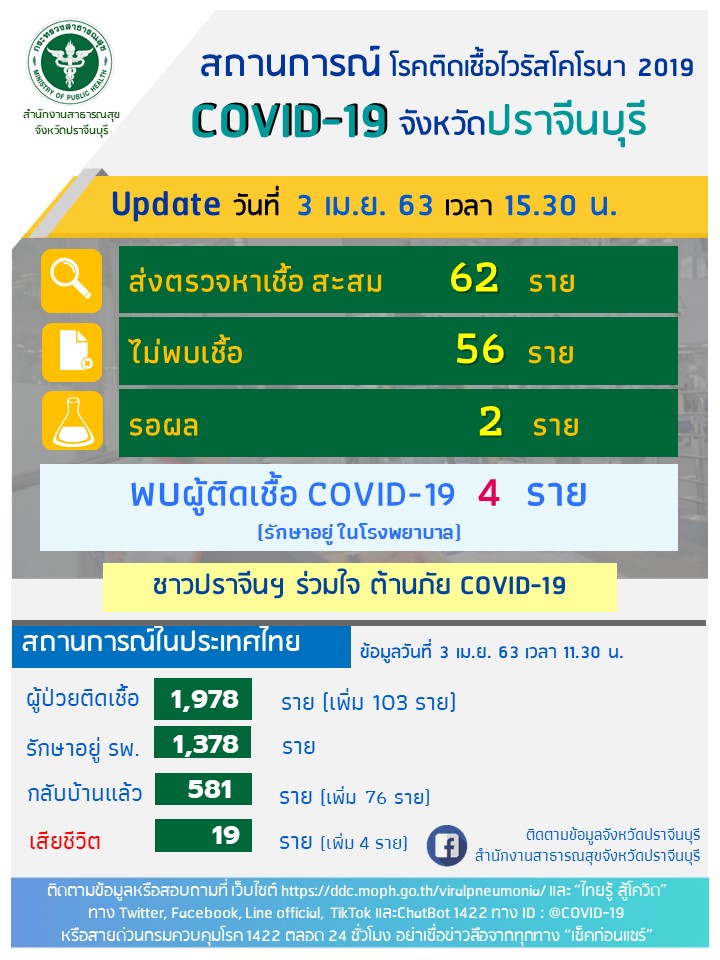 นายพิบูลย์ กล่าวว่า คณะกรรมการโรคติดต่อจังหวัดปราจีนบุรี โดยสำนักงานสาธารณสุขจังหวัดปราจีนบุรี ขอรายงานข่าวกรณีโรคติดเชื้อไวรัสโคโรนา 2019 (COVID-19) จังหวัดปราจีนบุรี ประจำวันที่ 3 เมษายน 2563 เวลา 15.30 น. ข้อมูลส่งตรวจหาเชื้อ สะสม 62 ราย ไม่พบเชื้อ 56 ราย รอผล 2 ราย ขณะนี้พบผู้ติดเชื้อ COVID-19 จำนวน 4 ราย