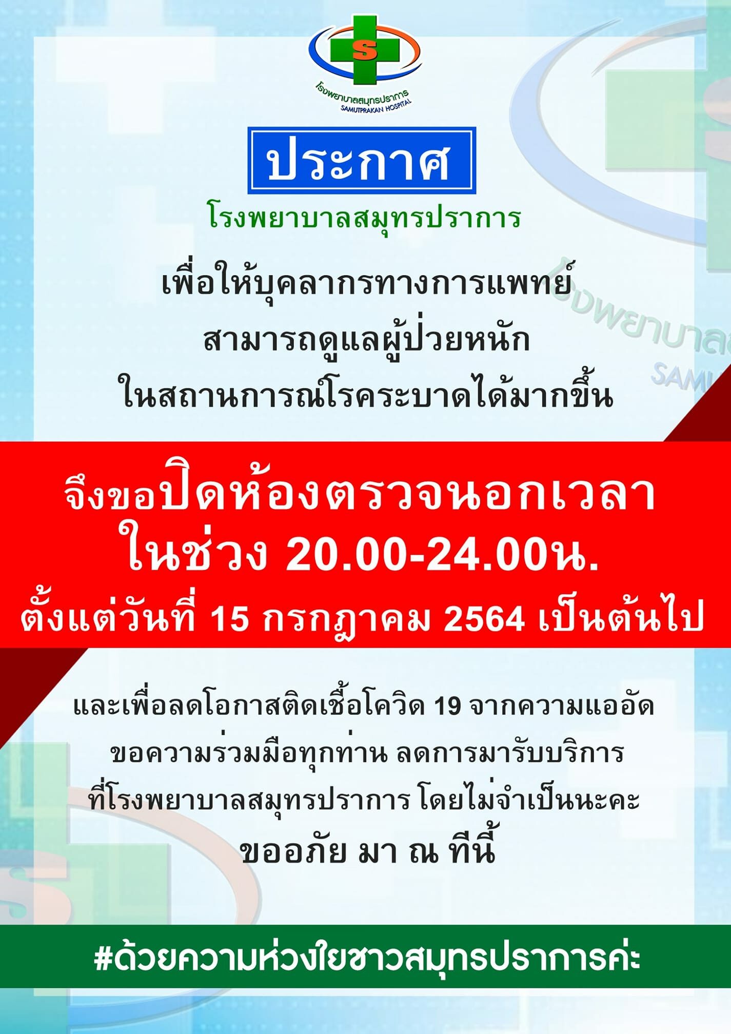 โรงพยาบาลสมุทรปราการ จึงขอปิดห้องตรวจนอกเวลา 20.00-24.00น. ตั้งแต่วันที่ 15 ก.ค.64 เป็นต้นไป