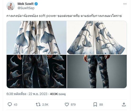 โดยระบุว่า "กางเกงปลาจ้องหม้อง soft power ของสงขลาครับ มาแข่งกับกางเกงแมวโคราช"