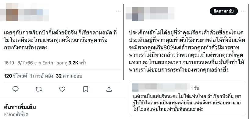 ก่อนมีชาวจีนมาตอบกลับว่า "คนจีนก็ต้องพูดภาษาจีนไม่ใช่หรือคะ พูดไทยทำไม ไม่มีมารยาทตรงไหนคะ" แฟนไทยก็สวนว่า "เรียกบิวกิ้นปกติก็ไม่ได้ยากนะคะ งง"