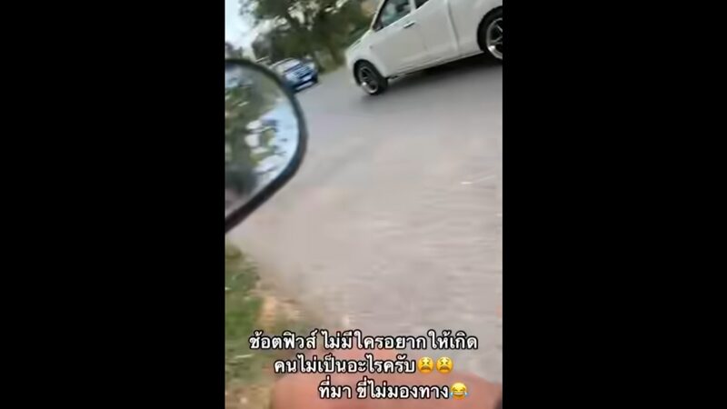 เป็นภาพในมุมของตัวคนขับขี่รถจยย. ที่กำลังขี่รถจยย.ไปด้วยพร้อมกับหันหลังกลับไปถ่ายคลิปรถกระบะแต่งคันสีขาวคาดดำ โดยที่ไม่มองทางข้างหน้า ก่อนที่รถจยย.จะพุ่งเสียหลักตามคลิปกล้องวงจรปิดที่จับภาพเหตุการณ์ได้