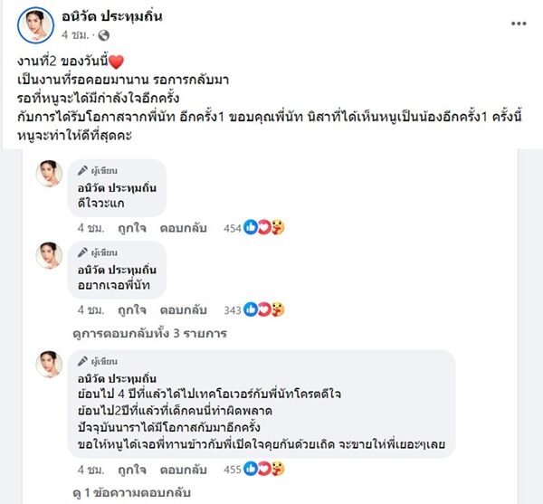 งานนี้เมื่อโพสต์ดังกล่าวเผยแพร่ออกไป ต่างมีแฟน ๆ เข้ามาส่งกำลังใจให้เธออย่างท้วมท้น