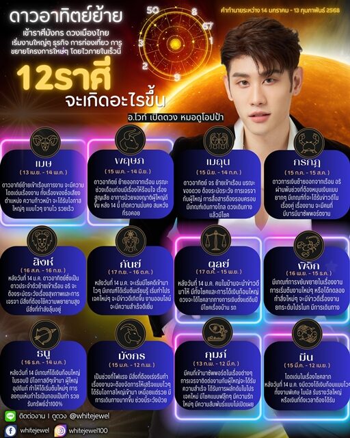 อ่านข่าวต้นฉบับได้ที่ : อ.ไวท์ เผย ดาวอาทิตย์ย้าย 12 ราศีจะเกิดอะไรขึ้น ราศีใดรับทรัพย์ฉ่ำ 100%