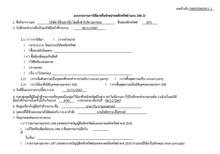 ผู้สื่อข่าวรายงานงว่า สำนักงานคณะกรรมการกำกับหลักทรัพย์และตลาดหลักทรัพย์(ก.ล.ต.) ได้รับแบบรายงานการได้มาหลักทรัพย์ของกิจการ (แบบ 246-2) ในหุ้นบริษัท บีทีเอส กรุ๊ป โฮลดิ้งส์ จำกัด (มหาชน) หรือBTS โดยนาย กวิน กาญจนพาสน์ ซึ่งเป็นผู้ถือหุ้นใหญ่อันดับ 3 โดยเป็นการได้มาเมื่อวันที่ 6 พ.ย. 2567 จำนวนลักทรัพย์ที่ได้มาจำนวน 1,053,333,334 หุ้น คิดเป็น 6.5449% ของสิทธิออกเสียงทั้งหมดของกิจการ จากเดิมมีหุ้นจำนวน 783,002,495 หุ้น คิดเป็น 5.9464% ของสิทธิออกเสียงทั้งหมดของกิจการ