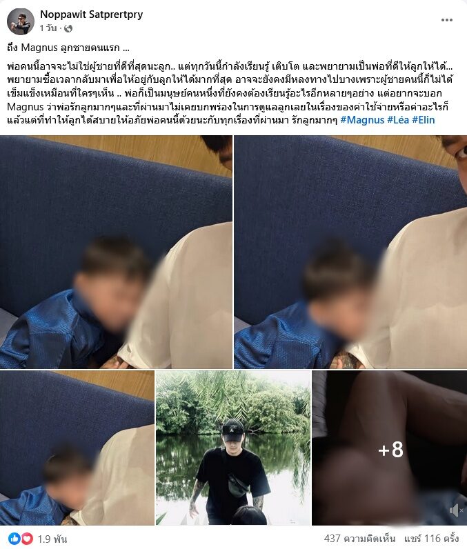 พ่อคนนี้อาจจะไม่ใช่ผู้ชายที่ดีที่สุดนะลูก.. แต่ทุกวันนี้กำลังเรียนรู้ เติบโต และพยายามเป็นพ่อที่ดีให้ลูกให้ได้… พยายามซื้อเวลากลับมาเพื่อให้อยู่กับลูกให้ได้มากที่สุด อาจจะยังคงมีหลงทางไปบางเพราะผู้ชายคนนี้ก็ไม่ได้เข็มแข็งเหมือนที่ใครๆเห็น .. พ่อก็เป็นมนุษย์คนหนึ่งที่ยังคงต้องเรียนรู้อะไรอีกหลายๆอย่าง แต่อยากจะบอก Magnus ว่าพ่อรักลูกมากๆและที่ผ่านมาไม่เคยบกพร่องในการดูแลลูกเลยในเรื่องของค่าใช้จ่ายหรือค่าอะไรก็แล้วแต่ที่ทำให้ลูกได้สบายให้อภัยพ่อคนนี้ด้วยนะกับทุกเรื่องที่ผ่านมา รักลูกมากๆ #Magnus #Léa #Elin”