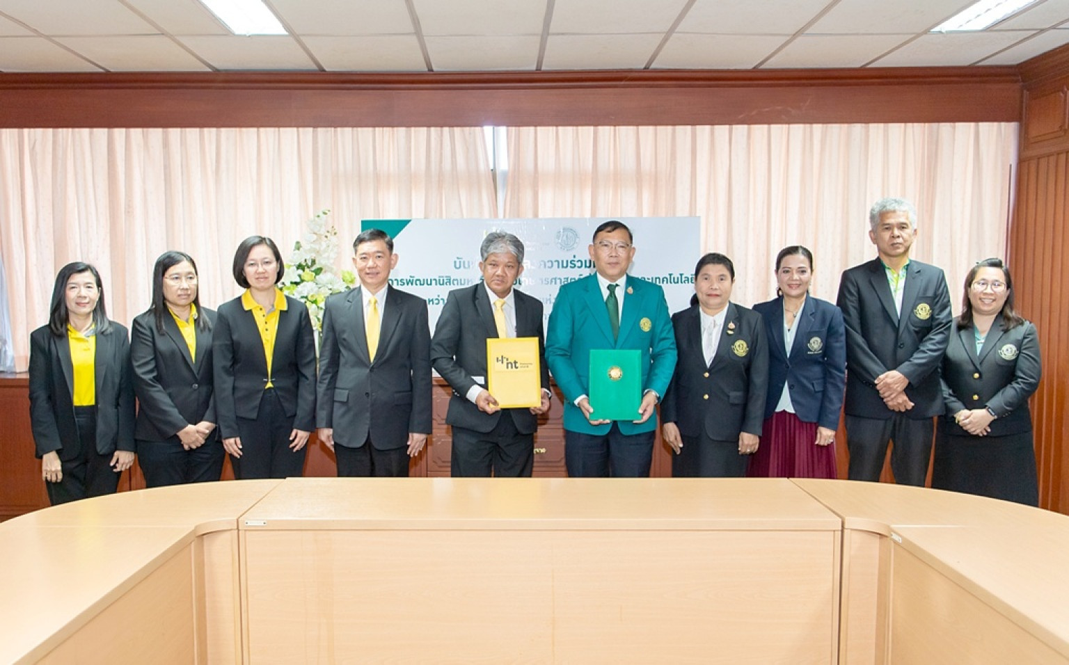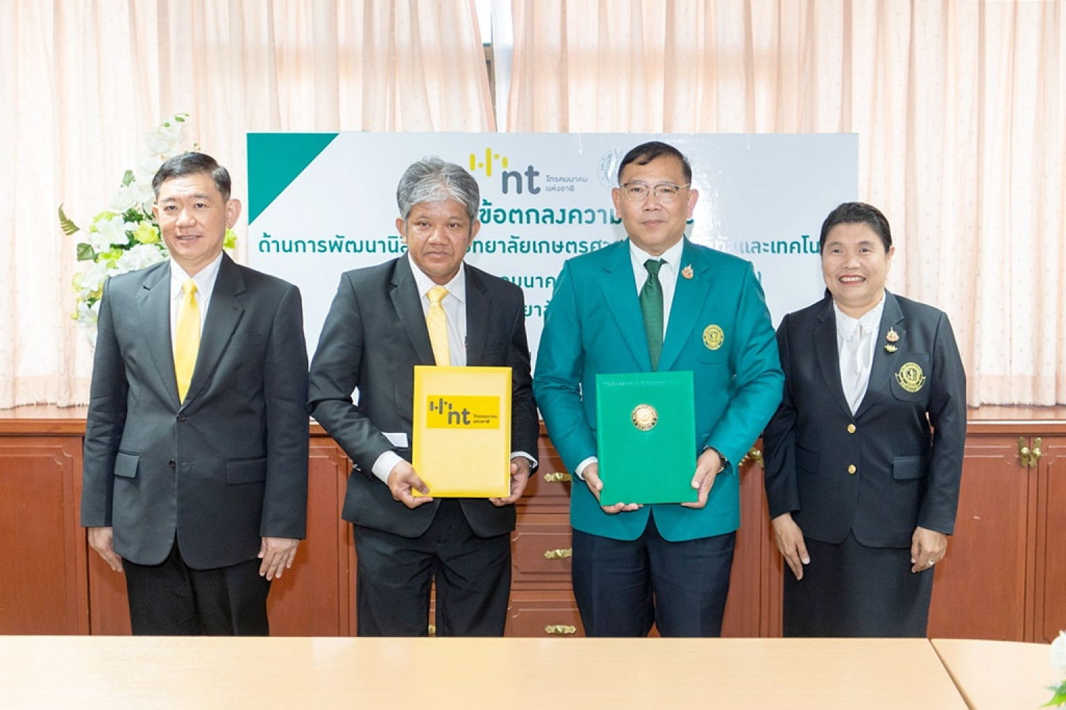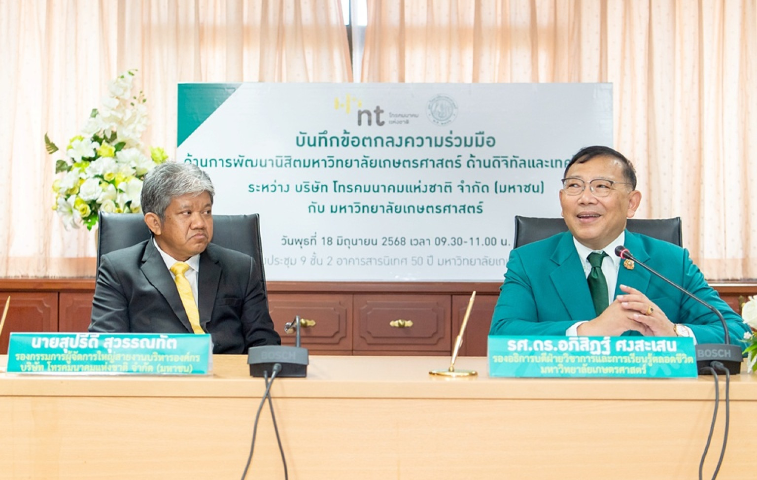 วันที่ 18 มิ.ย.68 ณ ห้องประชุม 9 อาคารสารนิเทศ 50 ปี มหาวิทยาลัยเกษตรศาสตร์ รศ.ดร.อภิสิฏฐ์ ศงสะเสน รองอธิการบดีฝ่ายวิชาการและการเรียนรู้ตลอดชีวิต เป็นประธานในพิธีลงนามบันทึกข้อตกลงความร่วมมือด้านการพัฒนานิสิตมหาวิทยาลัยเกษตรศาสตร์ ด้านดิจิทัลและเทคโนโลยี ระหว่าง มหาวิทยาลัยเกษตรศาสตร์ กับ บริษัท โทรคมนาคมแห่งชาติ จำกัด (มหาชน) และร่วมลงนามความร่วมมือกับ นายสุปรีดี สุวรรณทัต รองกรรมการผู้จัดการใหญ่สายงานบริหารองค์กร นายธีรยุทธ ศักดิ์วิลาสตระกูล ผู้ช่วยกรรมการผู้จัดการใหญ่กลุ่มทรัพยากรบุคคล บริษัท โทรคมนาคมแห่งชาติ จำกัด (มหาชน) โดยมีผู้บริหารของทั้งสองหน่วยงานร่วมเป็นสักขีพยาน