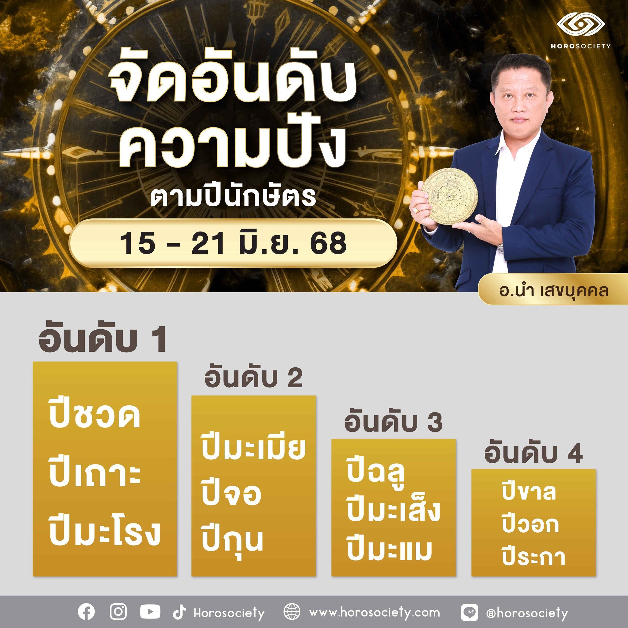 อ.นำ เสขบุคคล เผยในเพจดูดวงไพ่เทพนิมิต โดย อ.นำ เสขบุคคล โดยจัดอันดับความปัง ปีนักษัตร ถึงวันที่ 21 มิ.ย.68