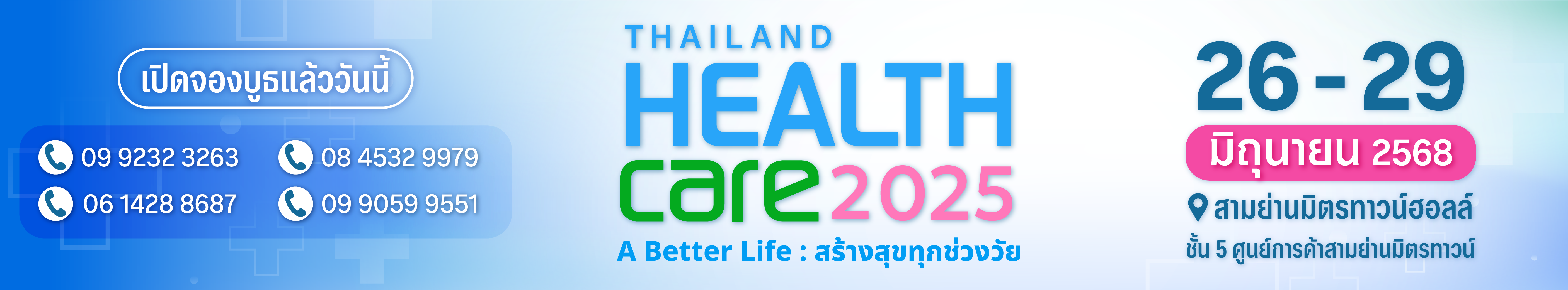 เจอกันที่งาน Thailand Healthcare 2025 ในวันที่ 26-29 มิ.ย. 2568 เวลา 10.00–20.00 น. ณ สามย่านมิตรทาวน์ฮอลล์ ชั้น 5 ศูนย์การค้าสามย่านมิตรทาวน์