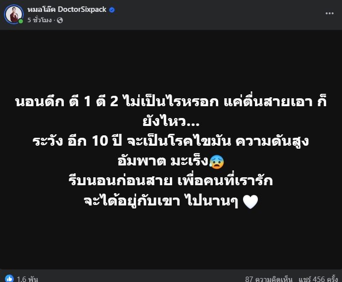 วันที่ 3 มิ.ย.2568 ผู้สื่อข่าวรายงานว่า นพ.ศุภฤกษ์ วิจารณาญาณ หรือ หมอโอ๊ค เจ้าของเพจ "หมอโอ๊ค DoctorSixpack" ได้โพสต์ข้อความระบุว่า "นอนดึก ตี 1 ตี 2 ไม่เป็นไรหรอก แค่ตื่นสายเอา ก็ยังไหว ระวัง อีก 10 ปี จะเป็นโรคไขมัน ความดันสูง อัมพาต มะเร็ง รีบนอนก่อนสาย เพื่อคนที่เรารัก จะได้อยู่กับเขา ไปนาน ๆ" โดย นพ.ศุภฤกษ์ อธิบายเพิ่มเติมว่า