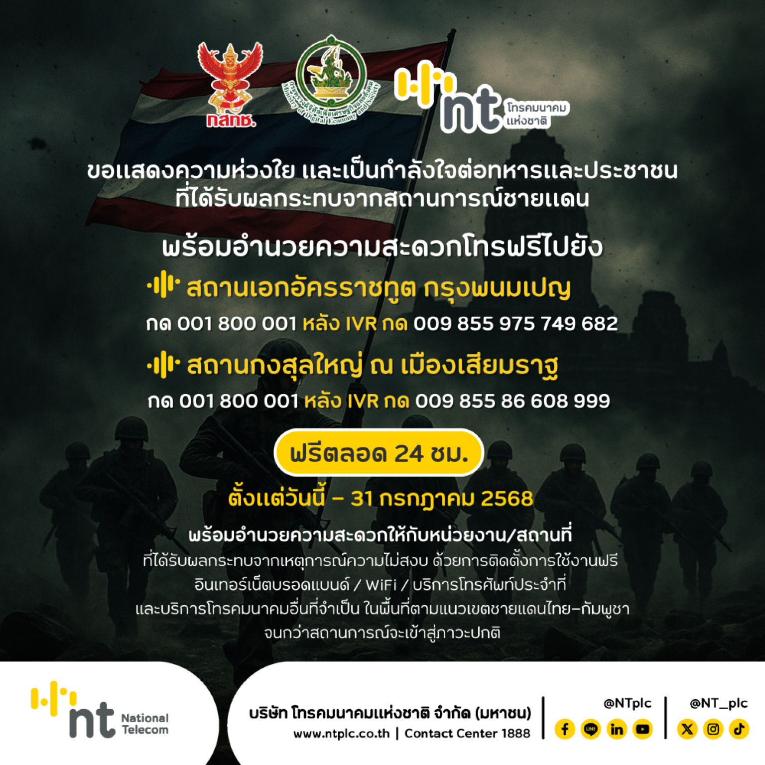 บริษัท โทรคมนาคมแห่งชาติ จำกัด (มหาชน) หรือ NT ขอแสดงความห่วงใยและเป็นกำลังใจต่อทหารและประชาชนที่ได้รับผลกระทบจากสถานการณ์ชายแดน พร้อมอำนวยความสะดวกให้กับหน่วยงาน/สถานที่ ที่ได้รับผลกระทบจากเหตุการณ์ความไม่สงบ โดยสามารถติดต่อโทรศัพท์ฟรีตลอด 24 ชม. ไปยังสถานเอกอัครราชทูตกรุงพนมเปญ และสถานกงสุลใหญ่ ณ เมืองเสียมราฐ ตั้งแต่วันนี้ - 31 กรกฎาคม 2568 และติดตั้งการใช้งานฟรี อินเทอร์เน็ตบรอดแบนด์ WiFi บริการโทรศัพท์ประจำที่ และบริการโทรคมนาคมอื่นที่จำเป็น ในพื้นที่ตามแนวเขตชายแดนไทย-กัมพูชา และในกรณีฉุกเฉินหรือต้องการความช่วยเหลือ
