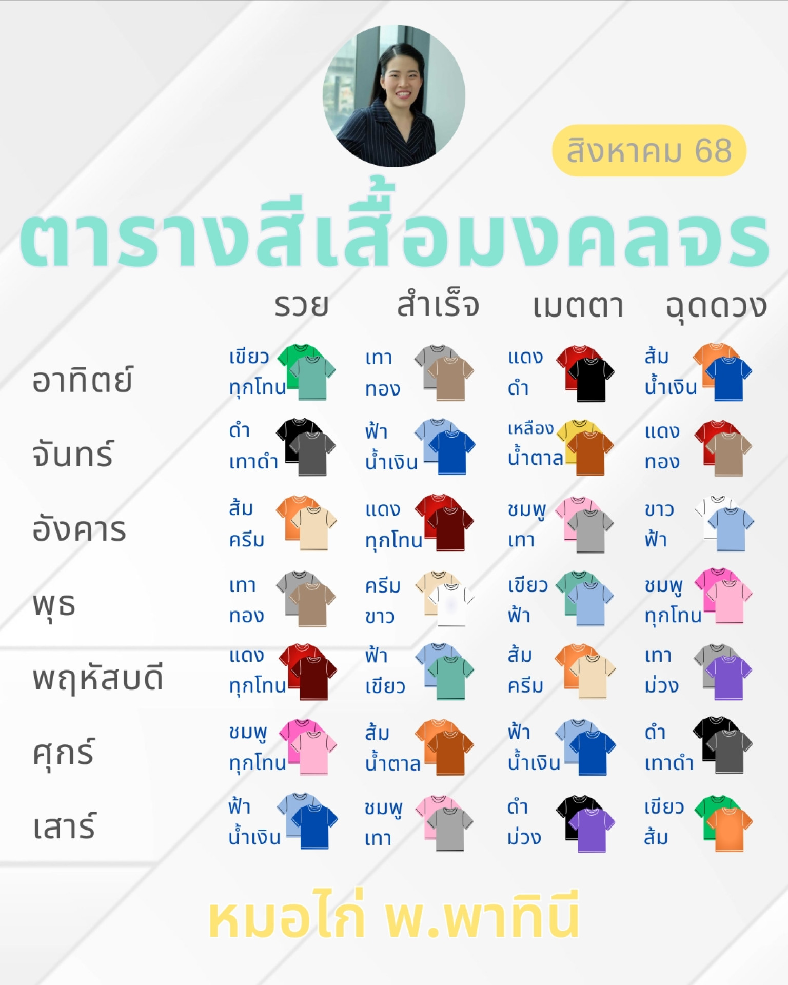 วันที่ 25 ก.ค.68 "หมอไก่" นักพยากรณ์ชื่อดัง โพสต์ข้อความผ่านอินสตาแกรม @morkai99 ระบุว่า… มาแล้วจ้า !! ตารางสีเสื้อมงคล เส...
