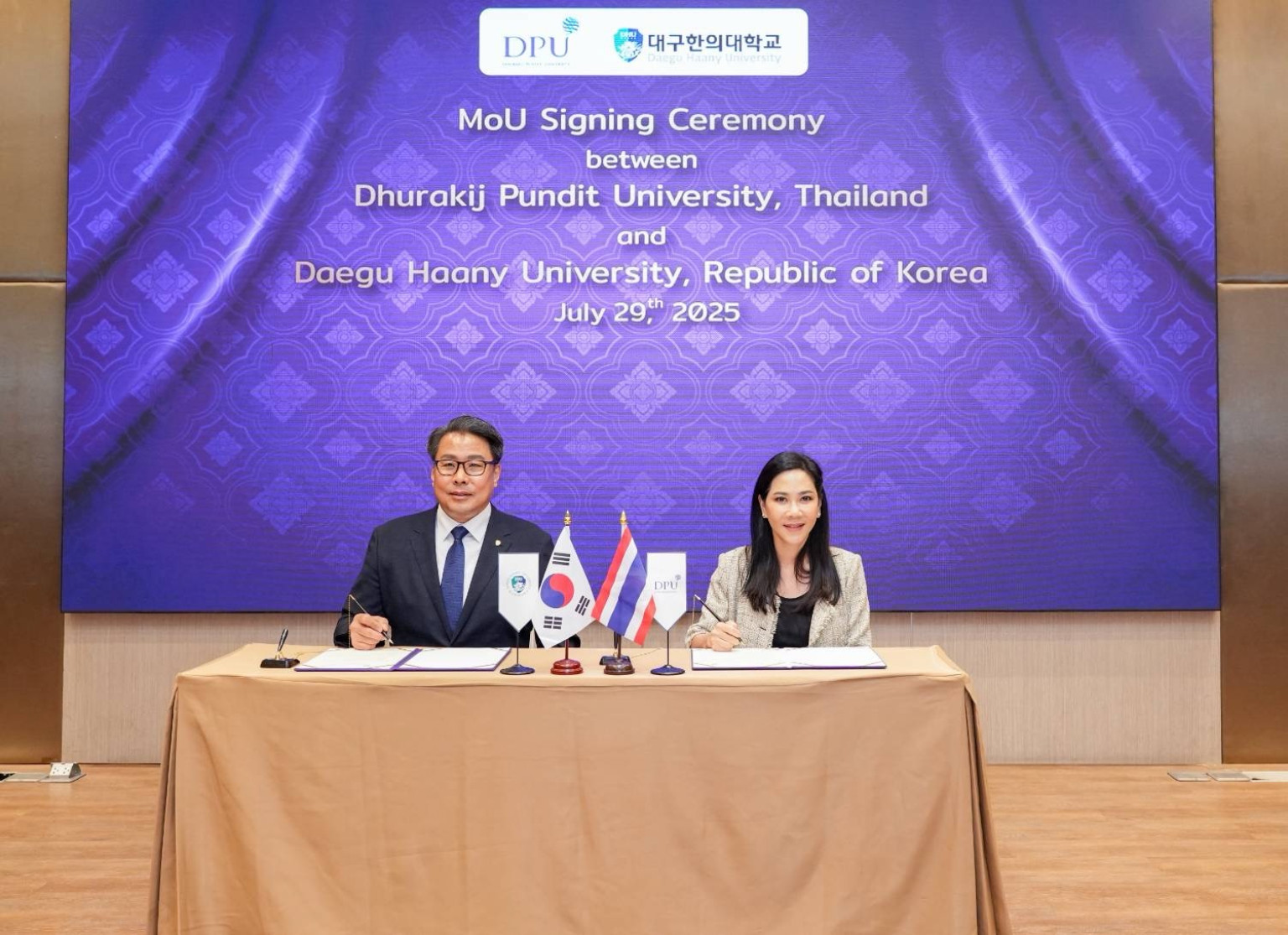 มหาวิทยาลัยธุรกิจบัณฑิตย์ (DPU) จัดพิธีลงนามบันทึกข้อตกลงความร่วมมือทางวิชาการและวิจัย กับ Daegu Haany University (DHU) จากประเทศเกาหลีใต้ เพื่อร่วมกันพัฒนาองค์ความรู้และส่งเสริมการเติบโตด้านสุขภาพและการแพทย์ทางเลือกในระดับสากล โดยมี ดร.ดาริกา ลัทธพิพัฒน์ อธิการบดีมหาวิทยาลัยธุรกิจบัณฑิตย์ (DPU) และ Dr. Byun Chang Hoon อธิการบดี Daegu Haany University (DHU) ร่วมลงนามเป็นผู้แทนของทั้งสองมหาวิทยาลัย โดยมีผู้ช่วยศาสตราจารย์ ดร.พัทธนันท์ เพชรเชิดชู รองอธิการบดีสายงานวิชาการ, ผู้ช่วยศาสตราจารย์ ดร.ศิริเดช คำสุพรหม รองอธิการบดีสายงานภาคีสัมพันธ์ , รศ.ดร.ภก.สุรพจน์ วงศ์ใหญ่ คณบดีวิทยาลัยเฮลท์ แอนด์ เวลเนส, ดร.วริศ ลิ้มลาวัลย์ คณบดีคณะศิลปศาสตร์ พร้อมด้วย Dean of Industry Academy Cooperation Foundation, HWANG Sezin , Dean of International Affairs, SONG Jichung ผู้บริหารทั้ง 2 ฝ่ายร่วมเป็นสักขีพยาน เมื่อวันที่ 29 กรกฎาคม 2568 ณ ห้องประชุมสัจจา 1 มหาวิทยาลัยธุรกิจบัณฑิตย์