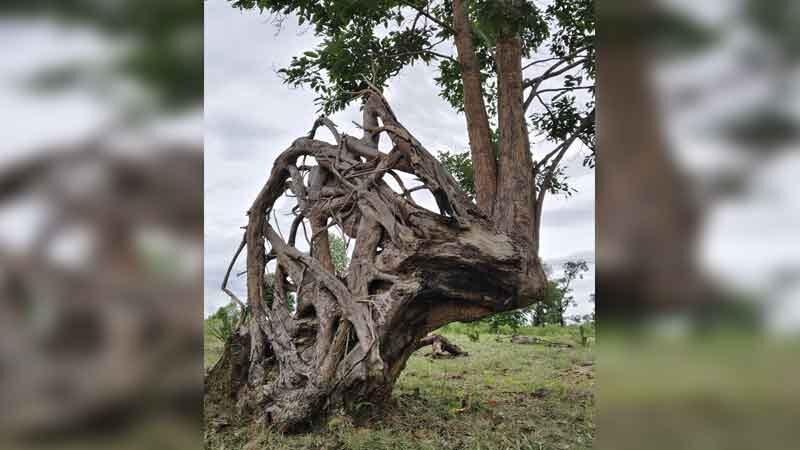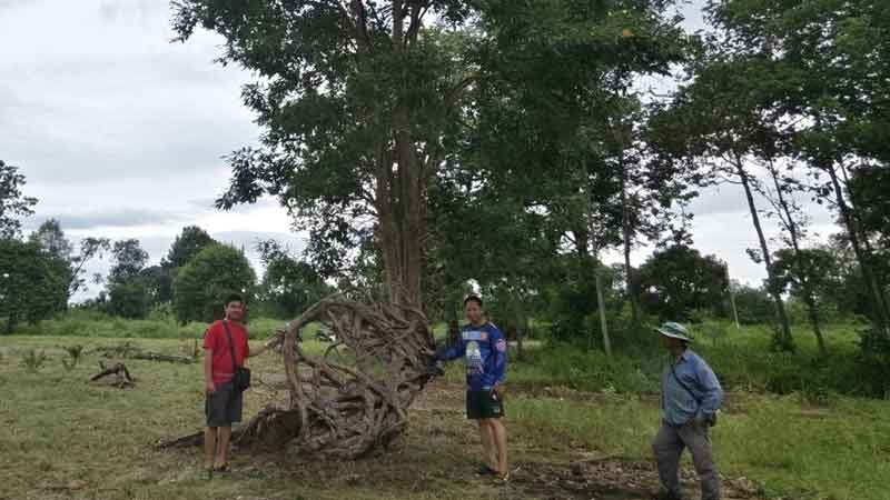 วันที่ 15 มิ.ย.2568 ผู้สื่อข่าวรายงานว่า ที่บริเวณปากทางเข้าวัดเขาถ้ำแกลบ บ้านสระหลวง ต.จระเข้หิน อ.ครบุรี จ.นครราชสีมา นายฐานวัฒน์ ภาษี อายุ 28 ปี ชาวบ้านสระหลวง พาไปดูต้นไม้สู้ชีวิตต้นหนึ่ง ที่แม้ว่าจะถูกลมและน้ำซัดโค่นล้มจนรากลอยขึ้นจากพื้นดินเกือบทั้งหมด รากลอยอยู่บนอากาศ แถมยังถูกตัดเอาส่วนลำต้นออกไปทั้งหมด แต่ก็ยังเอาชีวิตรอดอยู่ได้มาจนถึงทุกวันนี้