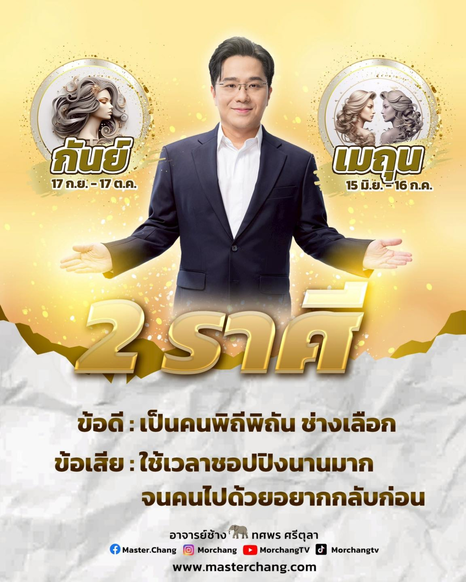 วันที่ 14 มิ.ย.68 "หมอช้าง" ทศพร ศรีตุลา นักพยากรณ์ชื่อดัง โพสต์ข้อความผ่านเฟซบุ๊ก หมอช้าง ทศพร ศรีตุลา ระบุว่า… ราศีกันย์ และ ...