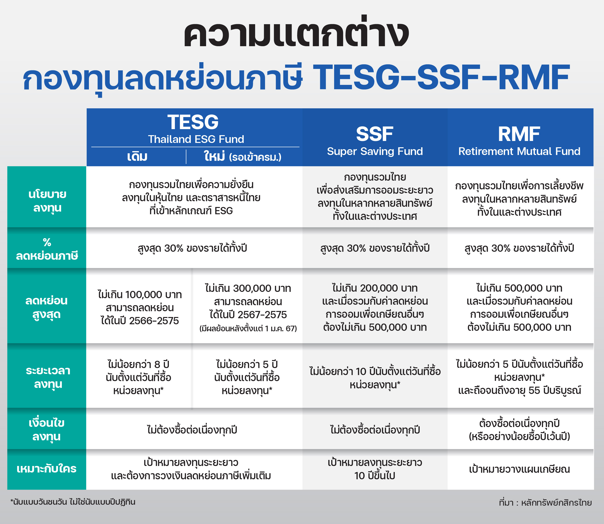 สำหรับกองทุน TESG หรือ Thailand ESG Fund ปรับเกณฑ์ใหม่มีนโนยบายเข้าลงทุนในหุ้นและตราสารหนี้ไทยที่เข้าหลักเกณฑ์ ESG และสามารถลดหย่อนภาษีได้สูงสุด 30% ของรายได้ทั้งปี และลดหย่อนสูงสุดไม่เกิน 300,000 บาท จากเดิมได้ไม่เกิน 100,000 บาท สามารถลดหย่อนได้ในปี 2566-2575 (มีผลย้อนหลังตั้งแต่ 1 มกราคม 2567) จากเดิมได้ในปี 2567-2575 และเงื่อนไขไม่ต้องซื้อต่อเนื่องทุกปี ซึ่งเหมาะสำหรับนักลงทุนระยะยาวและต้องการวงเงินลดหย่อนภาษีเพิ่มเติม