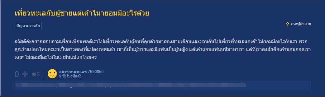 กลายเป็นประเด็นให้ชาวเน็ตแสดงความคิดเห็นกันยกใหญ่ เมื่อสมาชิกพันทิปหมายเลข 7690850 ได้ตั้งกระทู้ว่า "เที่ยวทะเลกับผู้ชายแต่เค้าไม่ยอมมีอะไรด้วย"