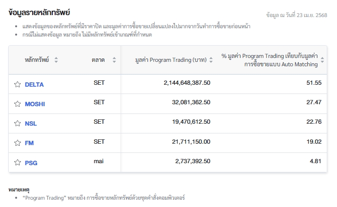 นอกจากนี้ ตลท.ยังรายงานข้อมูลหลักทรัพย์ที่ใช้ Program Trading ซื้อขายสูงสุด 5 อันดับ โดยเรียงจากเปอร์เซ็นต์ (%) มูลค่า Program Trading เทียบกับมูลค่าการซื้อขายแบบ Auto Matching ได้แก่ DELTA, MOSHI, NSL, FM, PSG