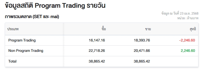 ผู้สื่อข่าวรายงานว่า วันนี้ (23 เม.ย.68) ตลาดหลักทรัพย์แห่งประเทศไทย (ตลท.) เปิดเผยข้อมูลซื้อขายรายวันผ่าน Program Trading หรือ “โปรแกรมโรบอทเทรดดิ้ง” มีมูลค่าซื้อจำนวน 16,147.16 ล้านบาท และมูลค่าขายจำนวน 18,393.76 ล้านบาท เท่ากับขายสุทธิ 2,246.60 ล้านบาท