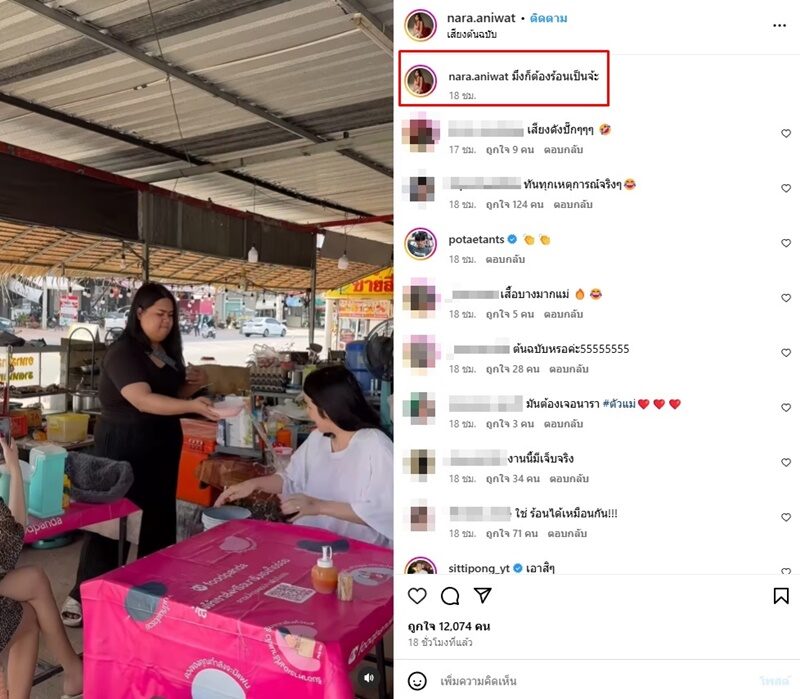 โดยมีคอมเมนต์รัวๆ เข้ามาบอกว่า ทันทุกเหตุการณ์จริงๆ , มันต้องเจอนารา #ตัวแม่ , ใช่ ร้อนได้เหมือนกัน!!! , กูคนมึงคน กูร้อนมึงร้อนค่ะ เป็นต้น