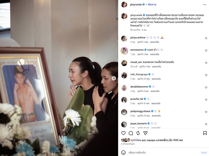 “ขอบคุณที่ป๊าเสียสละหลายๆอย่างเพื่อหลายๆคน ขอบคุณทุกอย่างบนโลกที่ทำให้เราเกิดมาเป็นพ่อลูกกัน ตอนนี้คิดถึงตัวเองได้แล้วน้า หลับให้สบายๆ ไม่ต้องห่วงอะไรเลย ทุกคนรักป๊าตลอดมาและจะรักตลอดไป” โดยเพื่อนๆในวงการต่างเข้ามาส่งหัวใจให้กำลังใจจำนวนมาก