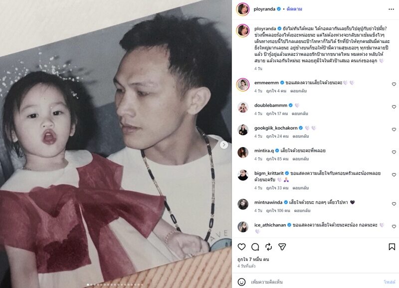 จากกรณี ดาราสาว พลอย รัญดภา แจ้งข่าวเศร้าสูญเสียคุณพ่อ โดยโพสต์สุดอาลัยภาพกับคุณพ่อและครอบครัวตั้งแต่ในวัยเด็ก และข้อความสุดเศร้าถึงคุณพ่อด้วยว่า