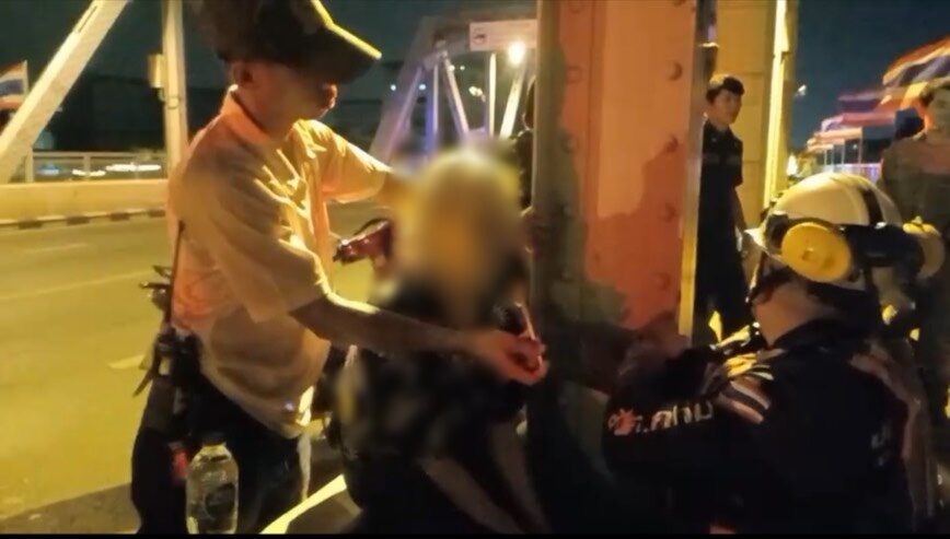 ที่เกิดเหตุบนสะพานกรุงธน พบหญิง 1 รายอายุประมาณ 80 ปี สภาพนั่งตัวสั่นอาจเกิดจากความตกใจ เจ้าหน้าที่จึงเจรจาเกลี้ยกล่อมประมาณ 20 นาที นำตัวเข้าอยู่ที่ปลอดภัย ก่อนส่งโรงพยาบาลใกล้เคียง