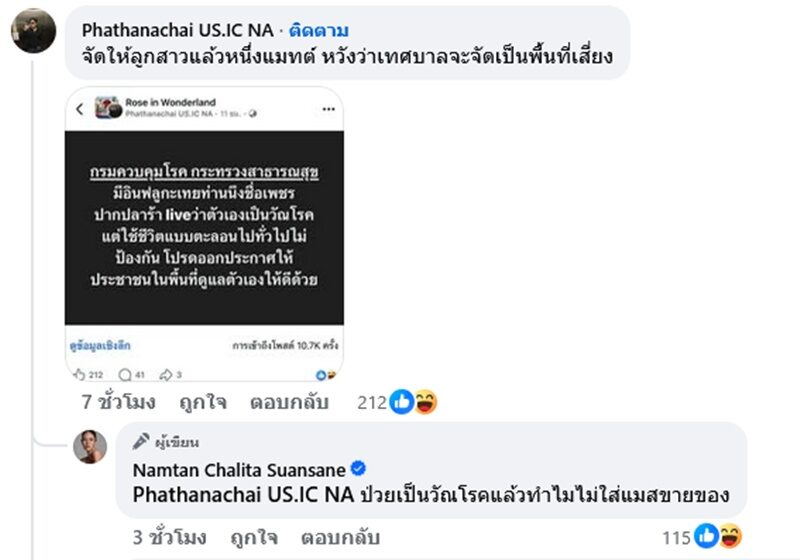 ท่ามกลางคอมเมนต์รัวๆกันต่างๆ นานา พร้อมทั้งให้กำลังใจ น้ำตาล ขณะที่มีคอมเมนต์หนึ่งแคปโพสต์ที่มีคนโพสต์ถึง กรมควบคุมโรค กระทรวงสาธารณสุขว่า “มีอินฟลูกะเทยท่านหนึ่งชื่อเพชรปากปลาร้า live ว่าตัวเองเป็นวัณโรค แต่ใช้ชีวิตแบบตะลอนไปทั่วไม่ป้องกัน โปรดออกประกาศให้ประชาชนในพื้นที่ดูแลตัวเองให้ดีด้วย” งานนี้ น้ำตาล ก็มาคอมเมนต์ตั้งคำถามด้วยว่า “ป่วยเป็นวัณโรคแล้วทำไมไม่ใส่แมสขายของ”