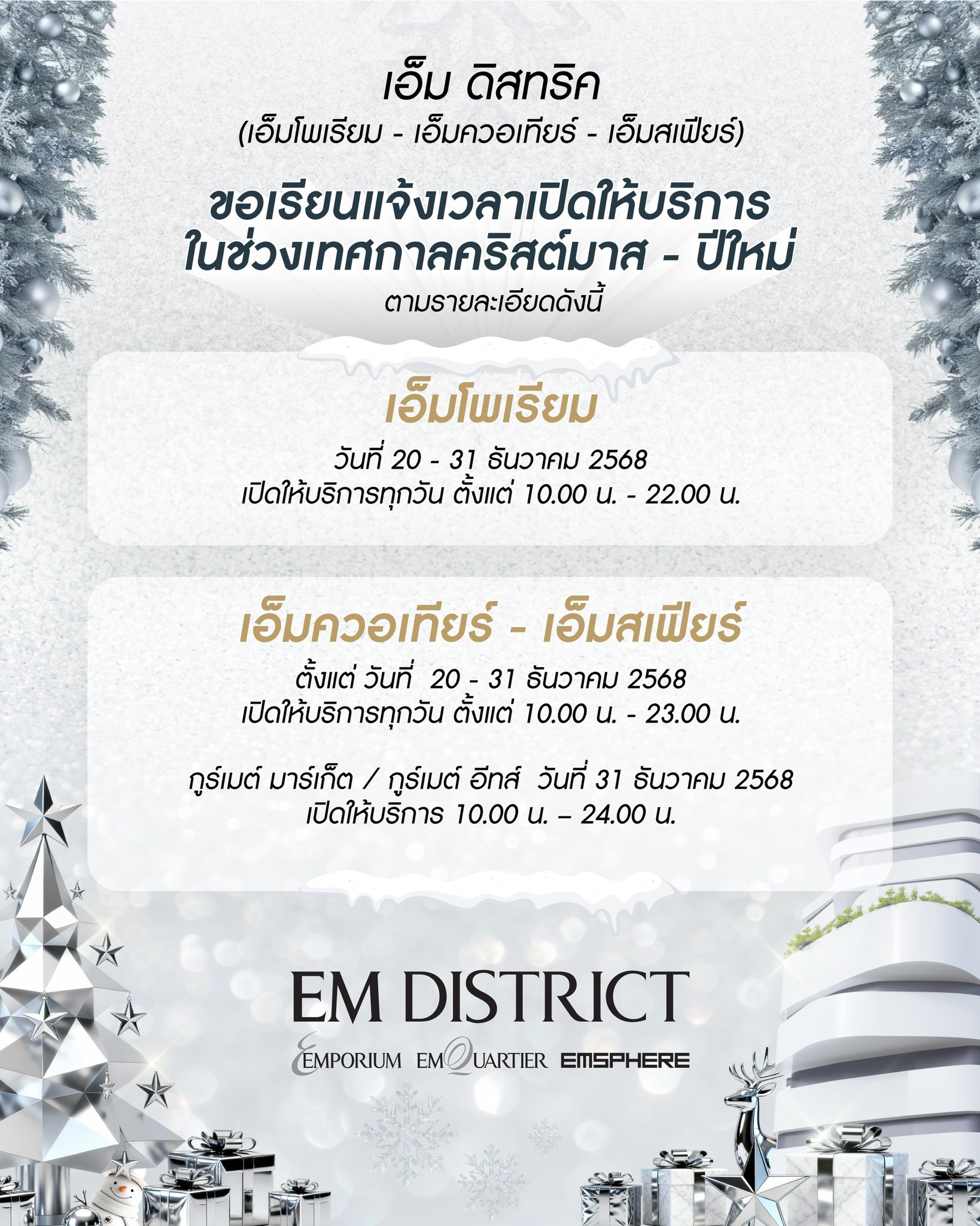 ศูนย์การค้า EM DISTRICT ได้แก่ Emporium, EmQuartier และ EmSphere ปรับเวลาให้บริการตั้งแต่วันที่ 20-31 ธันวาคม 2568 ดังนี้