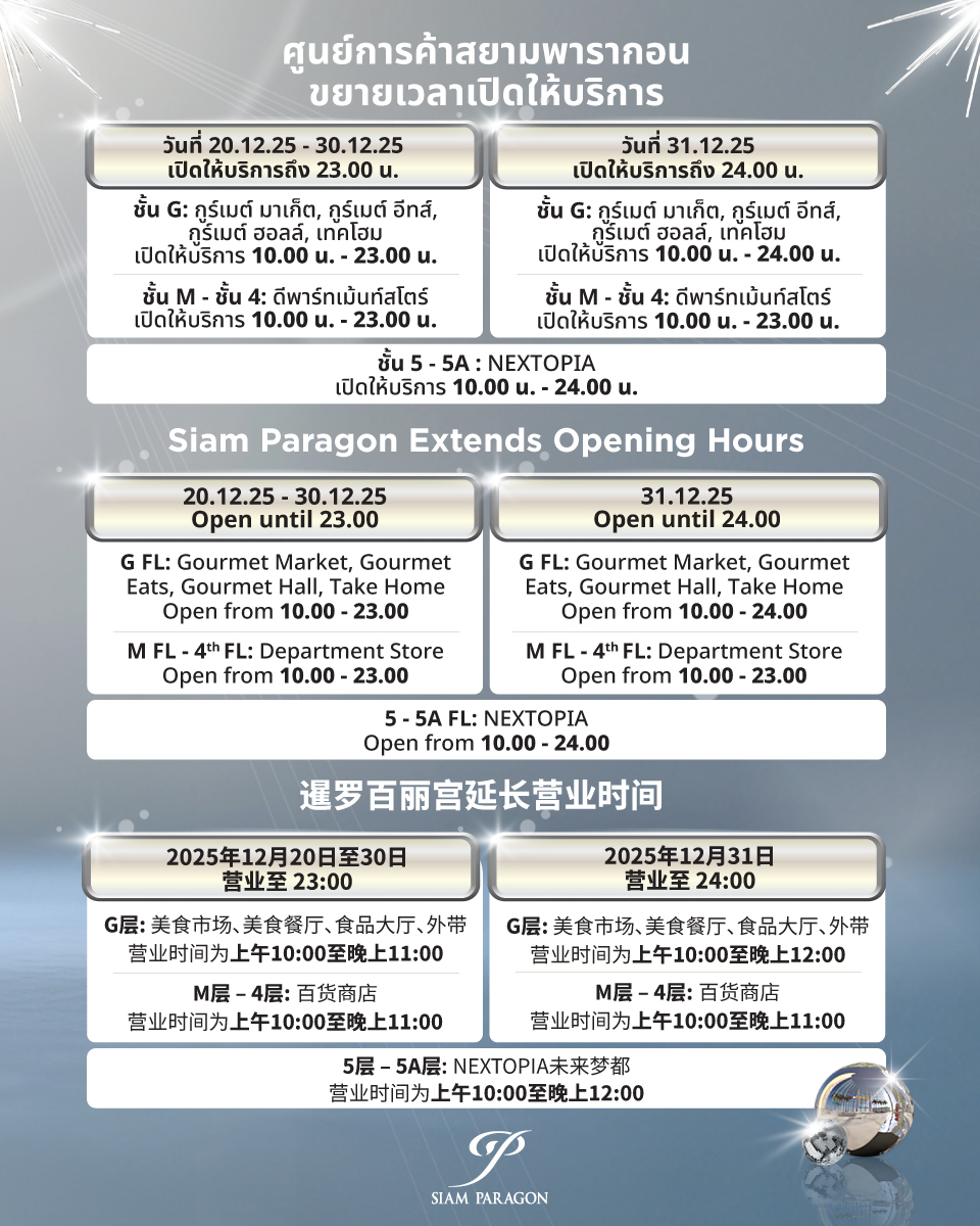 ศูนย์การค้าสยามพารากอน ขยายเวลาเปิดให้บริการ ตั้งแต่วันที่ 20-31 ธันวาคม 2568 โดยวันที่ 20-30 ธ.ค. เปิดให้บริการถึง 23.00 น. และวันที่ 31 ธ.ค. เปิดให้บริการโซนชั้น G ถึง 24.00 น. (ดีพาร์ตเมนต์สโตร์ เปิดถึง 23.00 น.) และพื้นที่ NEXTOPIA ชั้น 5 และชั้น 5A เปิดบริการจนถึง 24.00 น.