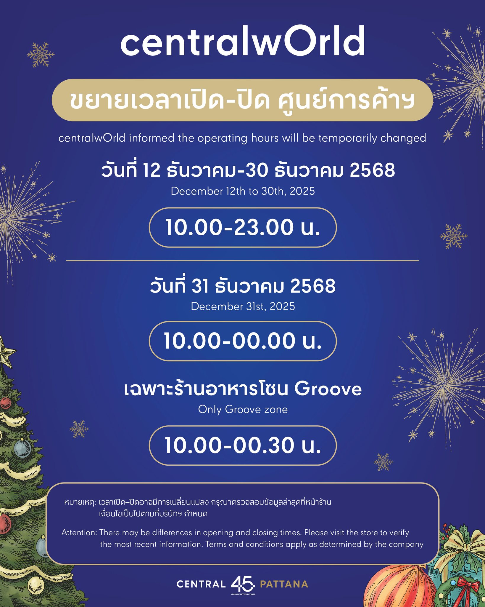 ศูนย์การค้าเซ็นทรัลเวิลด์ ปรับเวลาให้บริการตั้งแต่ 12-31 ธันวาคม 2568 โดยปรับเปลี่ยนเวลาให้บริการดังนี้