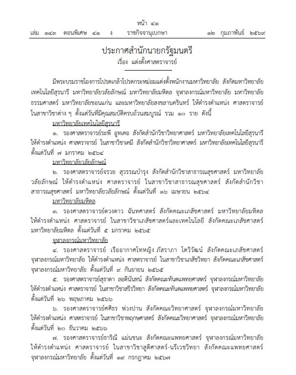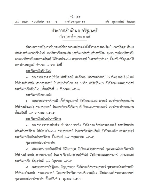 โดยประกาศฉบับแรกความว่า มีพระบรมราชโองการโปรดเกล้าฯ แต่งตั้งข้าราชการพลเรือนในสถาบันอุดมศึกษา สังกัดมหาวิทยาลัยเชียงใหม่ มหาวิทยาลัยขอนแก่น มหาวิทยาลัยศรีนครินทรวิโรฒ จุฬาลงกรณ์มหาวิทยาลัย และมหาวิทยาลัยสงขลานครินทร์ ให้ดำรงตำแหน่ง ‘ศาสตราจารย์’ ในสาขาวิชาต่าง ๆ ตั้งแต่วันที่มีคุณสมบัติครบถ้วนสมบูรณ์ จำนวน 6 ราย ดังนี้