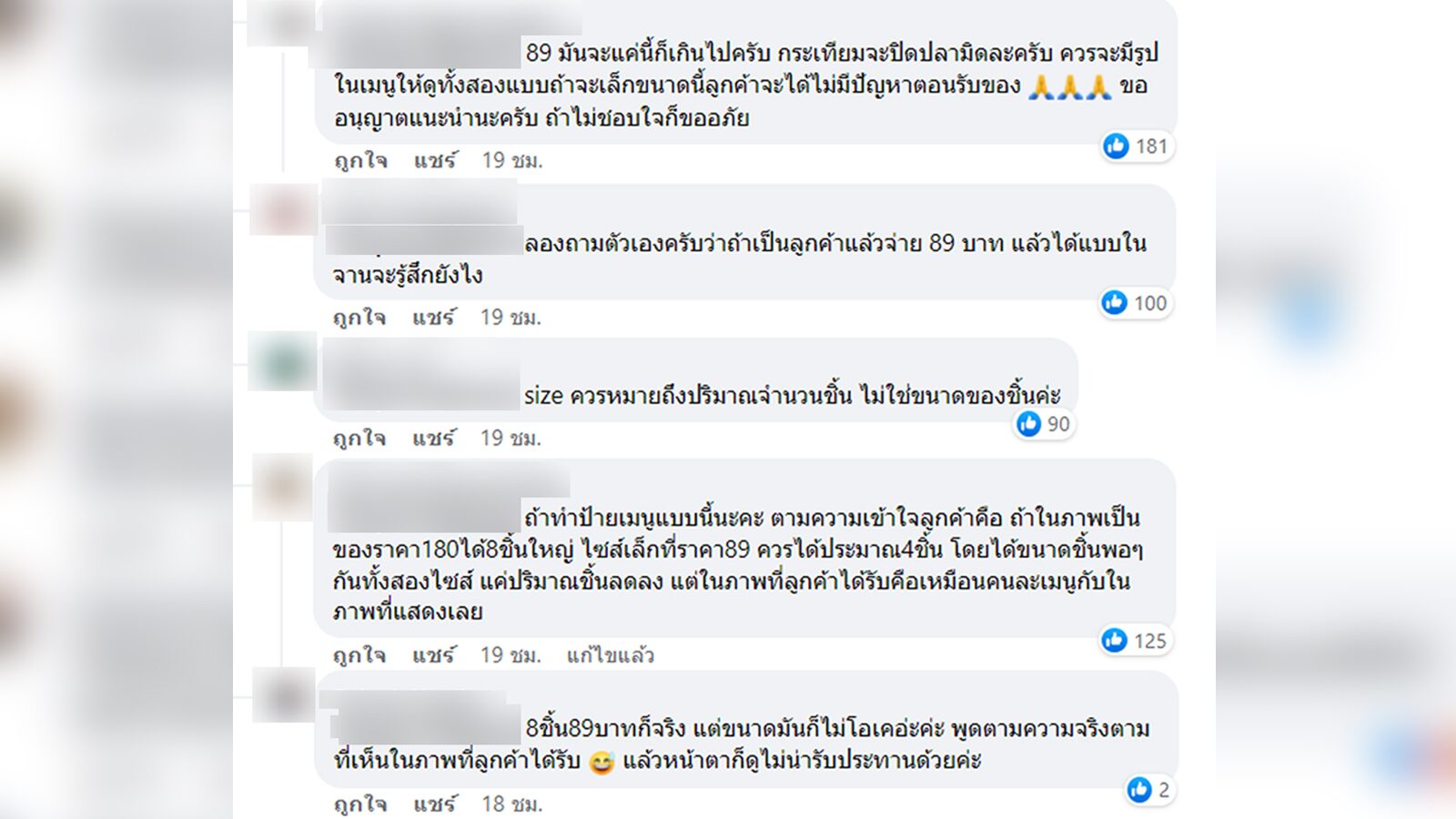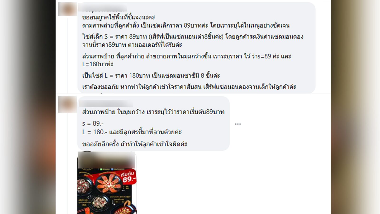 ส่วนภาพเมนูที่ลูกค้าถ่ายมา ถ้าขยายในมุมกว้างขึ้น จะเห็นว่าทางร้านมีการระบุราคาเอาไว้แล้วว่า "ไซซ์ S ราคา 89 บาท" และ"ไซซ์ L ราคา 180 บาท (เสิร์ฟเป็นแซลมอนซาซิมิ 8 ชิ้น)" และมีลูกศรชี้ให้ดูด้วย แต่ทางร้านก็ต้องอภัย หากทำให้ลูกค้าเข้าใจผิดหรือสับสน