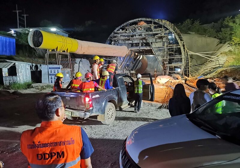 พบสัญญาณชีพ 3 คนงานใต้อุโมงค์ถล่ม ดินถมทับจากภายนอกเข้าไปในชั้นดินประมาณ 6 เมตร คาดว่ายังมีชีวิตอยู่ รถกู้ชีพพร้อมแพทย์รอปากทางเข้าอุโมงค์