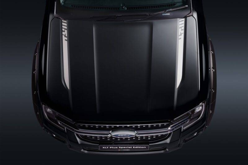รุ่นพิเศษ Ford Ranger XLT Plus Special Edition 4 ประตู เข้มด้วยชุดแต่งสีดำไม่ว่าจะเป็นคิ้วขอบล้อสีดำทรงใหญ่ สปอร์ตบาร์ และสติ๊กเกอร์ชื่อ Ranger ด้านข้างตัวรถ และฝากระโปรงด้านหน้า