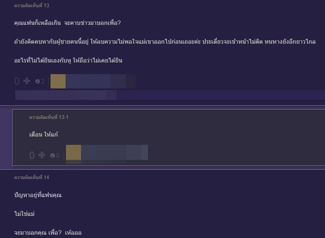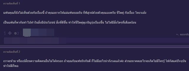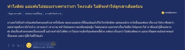 ,"มันขึ้นอยู่กับแฟนคุณ ไม่ได้ขึ้นกับแม่" ขณะที่อีกมุมกลับมองว่า แฟนไม่ควรนำเรื่องนี้มาบอกกับเจ้าของกระทู้ "ปัญหาอยู่ที่แฟนคุณ ไม่ใช่แม่ จะมาบอกคุณ เพื่อ? เฮ้ออ"
