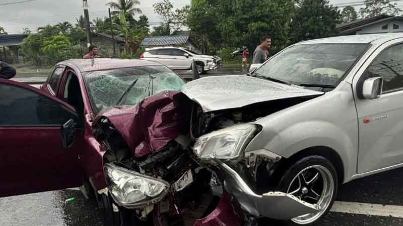 หมอแล็บหวิดสิ้นชื่อ ฝนตกถนนลื่น เก๋งเหินข้ามเกาะกลาง พุ่งประสานงากระบะเลนสวน พังยับ